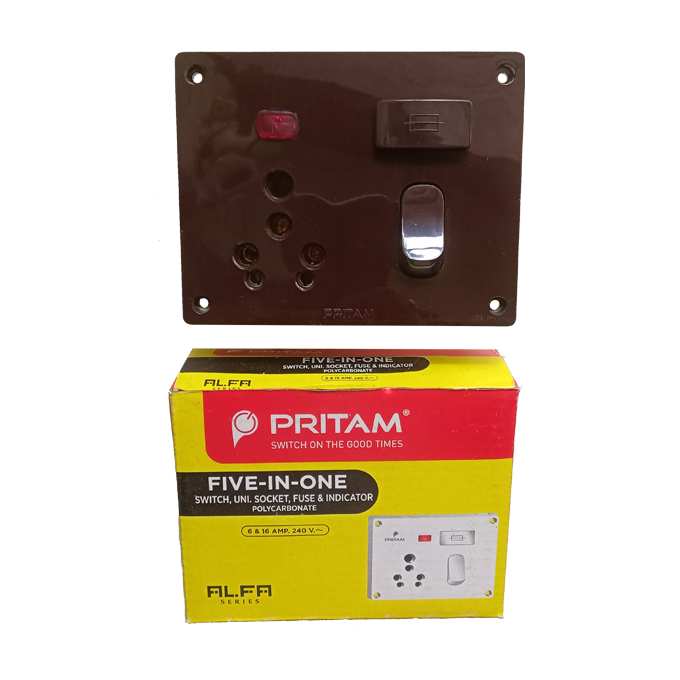 5 in 1 Switch Socket Fuse Indicator Unit PRITAM, 16 Amp, Brown